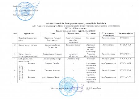 Абай облысы білім басқармасының Аягөз ауданы білім бөлімінің «№ 1 Ақшәулі жалпы орта білім беретін мектебі» КММ-де мектеп директоры