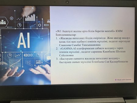 «Жасанды интеллект біздің өмірімізде. Жеке аватар жасау» , тарих пәнінің мұғалімі , педагог-сарапшы Какибаева Ш.С «GAMMA AI платформасын сабақта қолдану» , бастауыш сынып мұғалімі Егинбаева С.Қ
