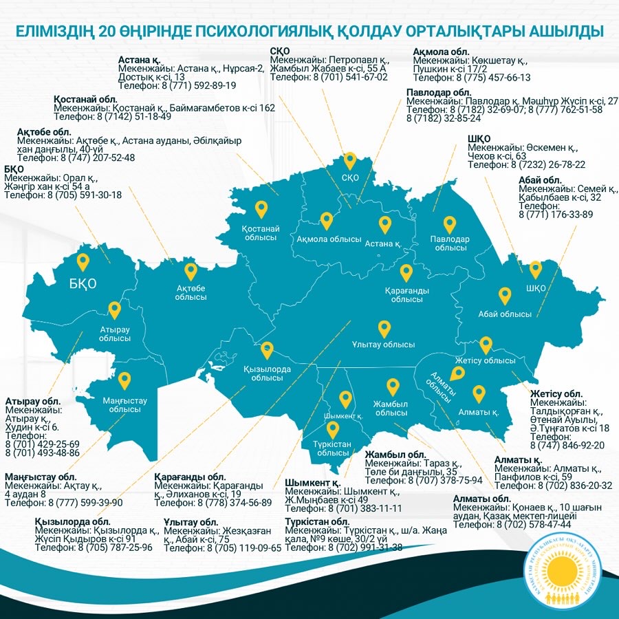 ✍🏻 Мемлекет басшысының тапсырмасына сәйкес еліміздің барлық 20 өңірінде балаларға психологиялық қолдау көрсету орталығы жұмыс істей бастады. Басты міндет – балалардың, ата-аналар мен педагогтерге психологиялық және әдістемелік көмек көрсетуді күшейту мақсатында жергілікті деңгейде психологиялық қызметтің бірыңғай жүйесін құру.